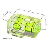 Aus transparentem Kunststoff gefertigte Kreuzlibelle zum Aufstecken an den ISO-Blitzschuh der Kamera.